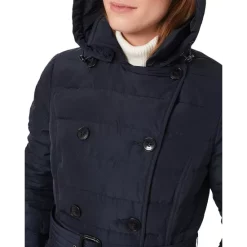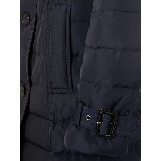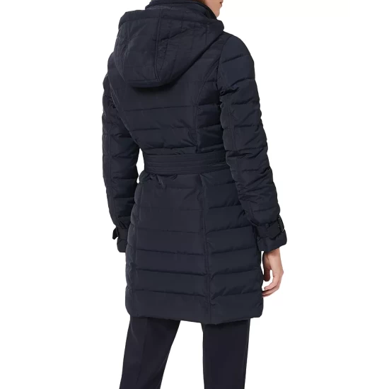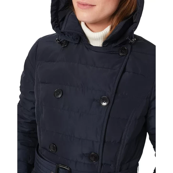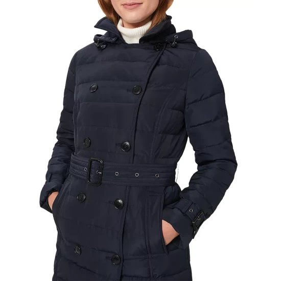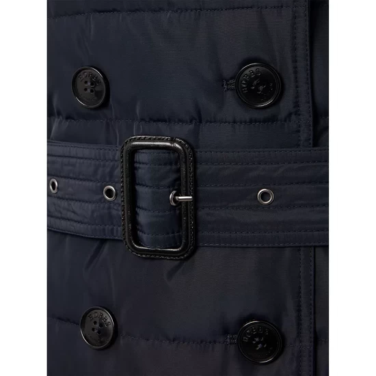 - Buckled belt at waist, top-stitched trim