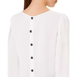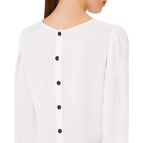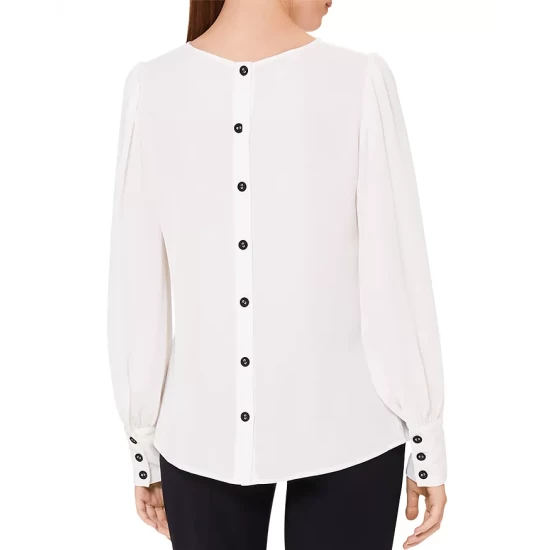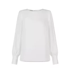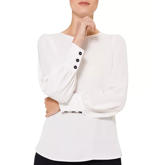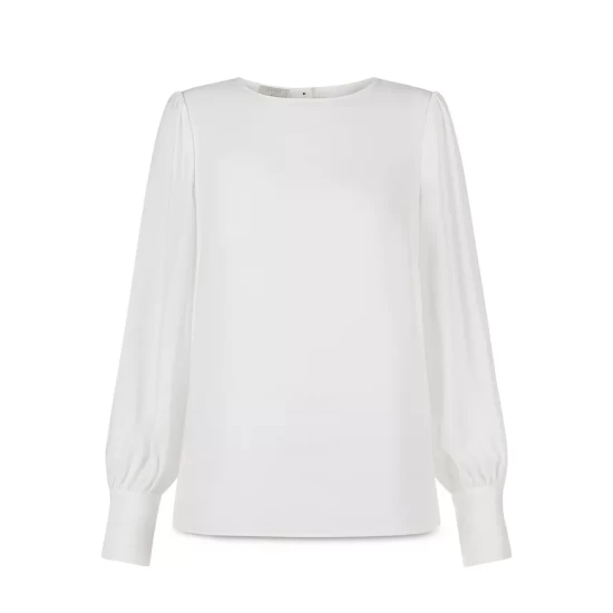 - Long blouson sleeves with buttoned cuffs