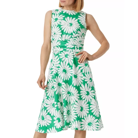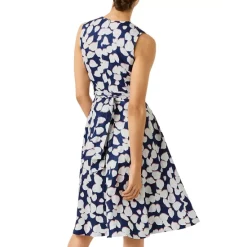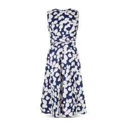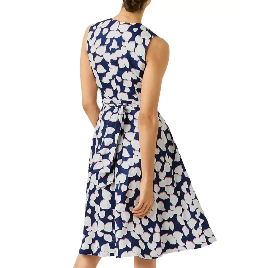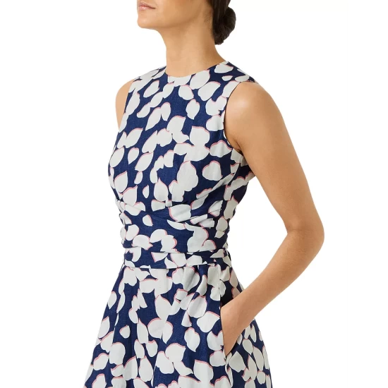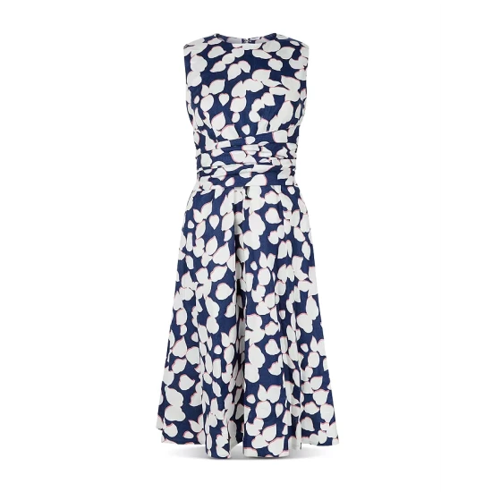 - Signature waist ties to define the figure, sleek sleeveless design with a feminine flared skirt