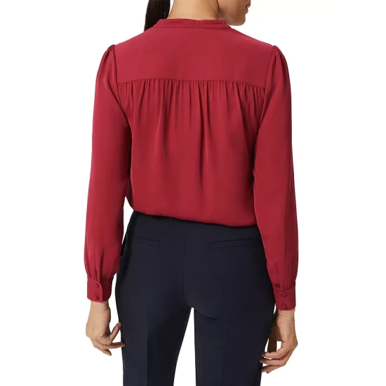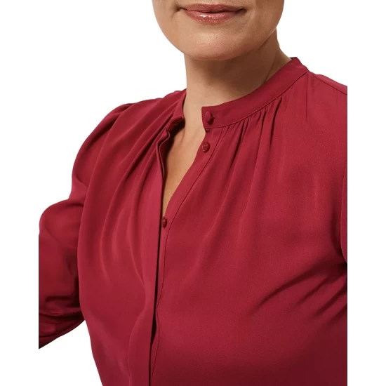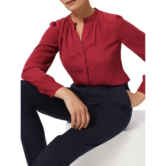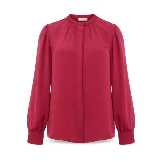 - Long sleeves, gathered shoulders, double-buttoned cuffs